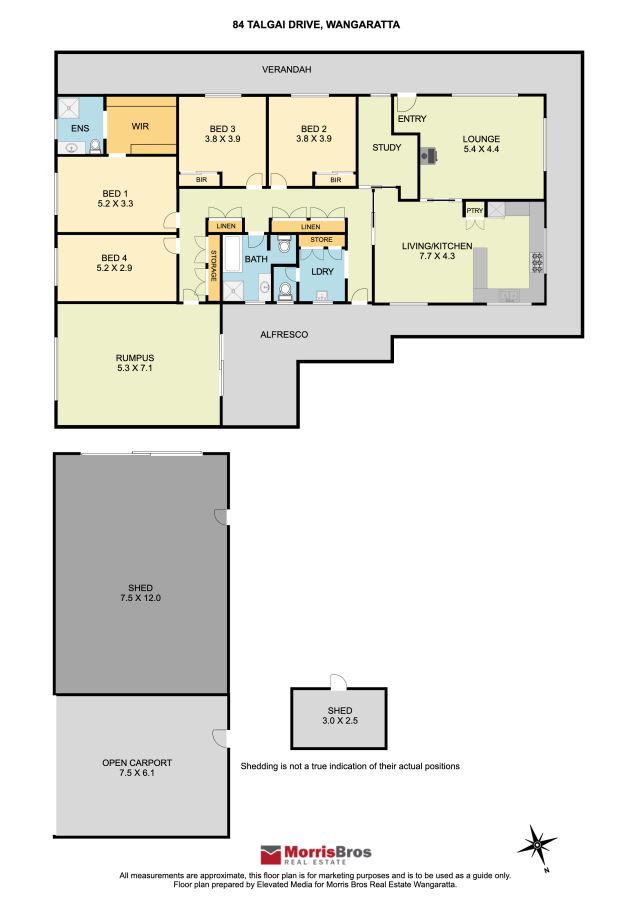 A 12m x 7.5m colorbond shed with 15-amp power and concrete floor includes lockable workshop storage and two car accommodation.