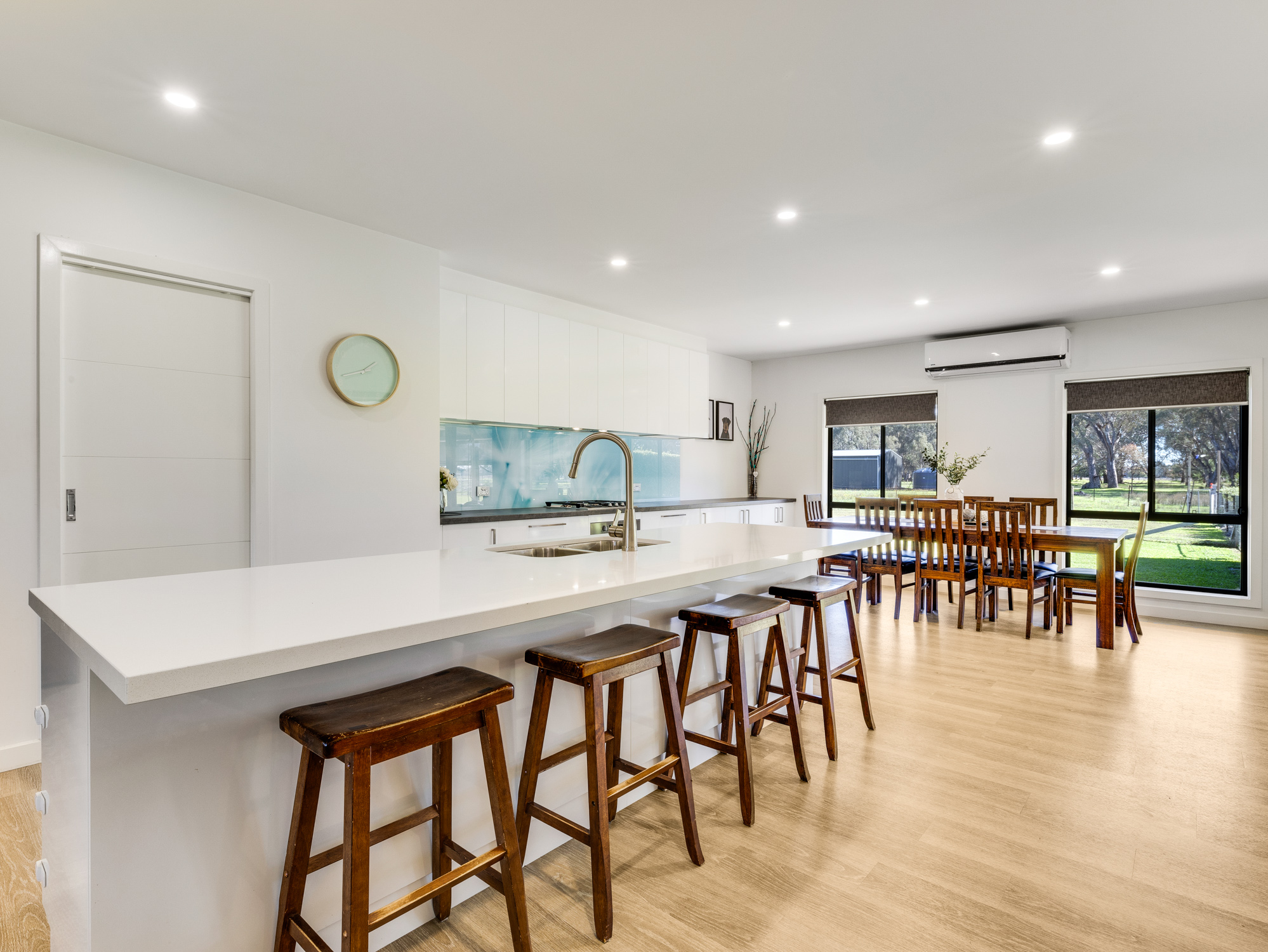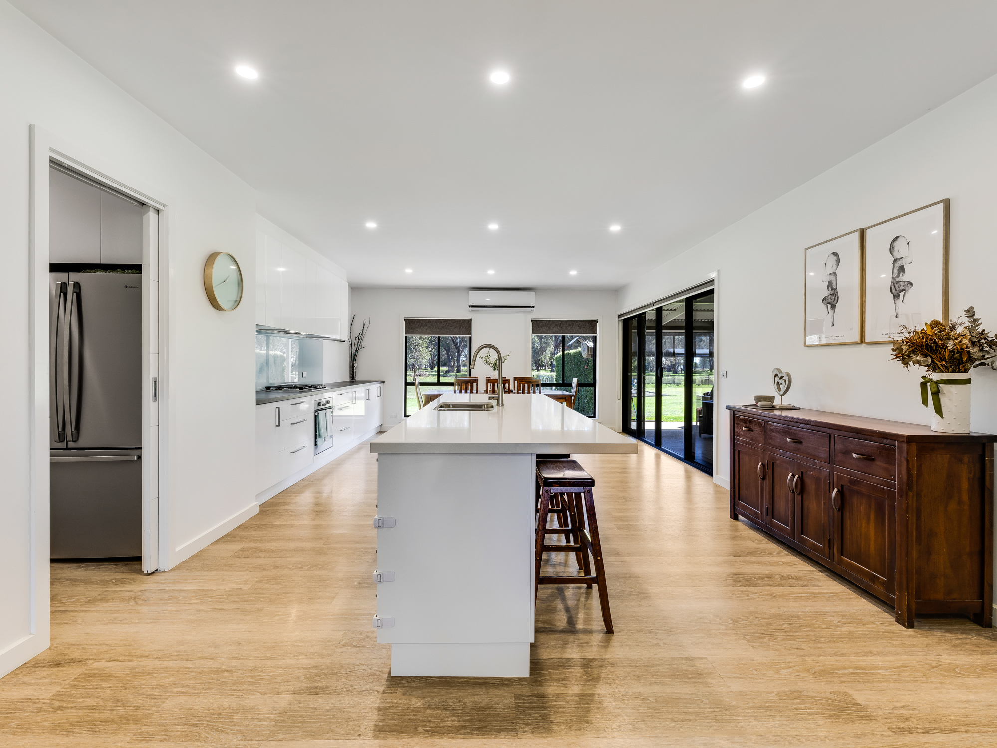 The kitchen is a delight with a fully fitted butlers pantry, gas hot plates, dishwasher and under bench oven. The caesar stone bench tops give a luxury finish to the workspace. The whole living area is serviced by a 7kw split system plus a highly efficient and cosy wood heater.