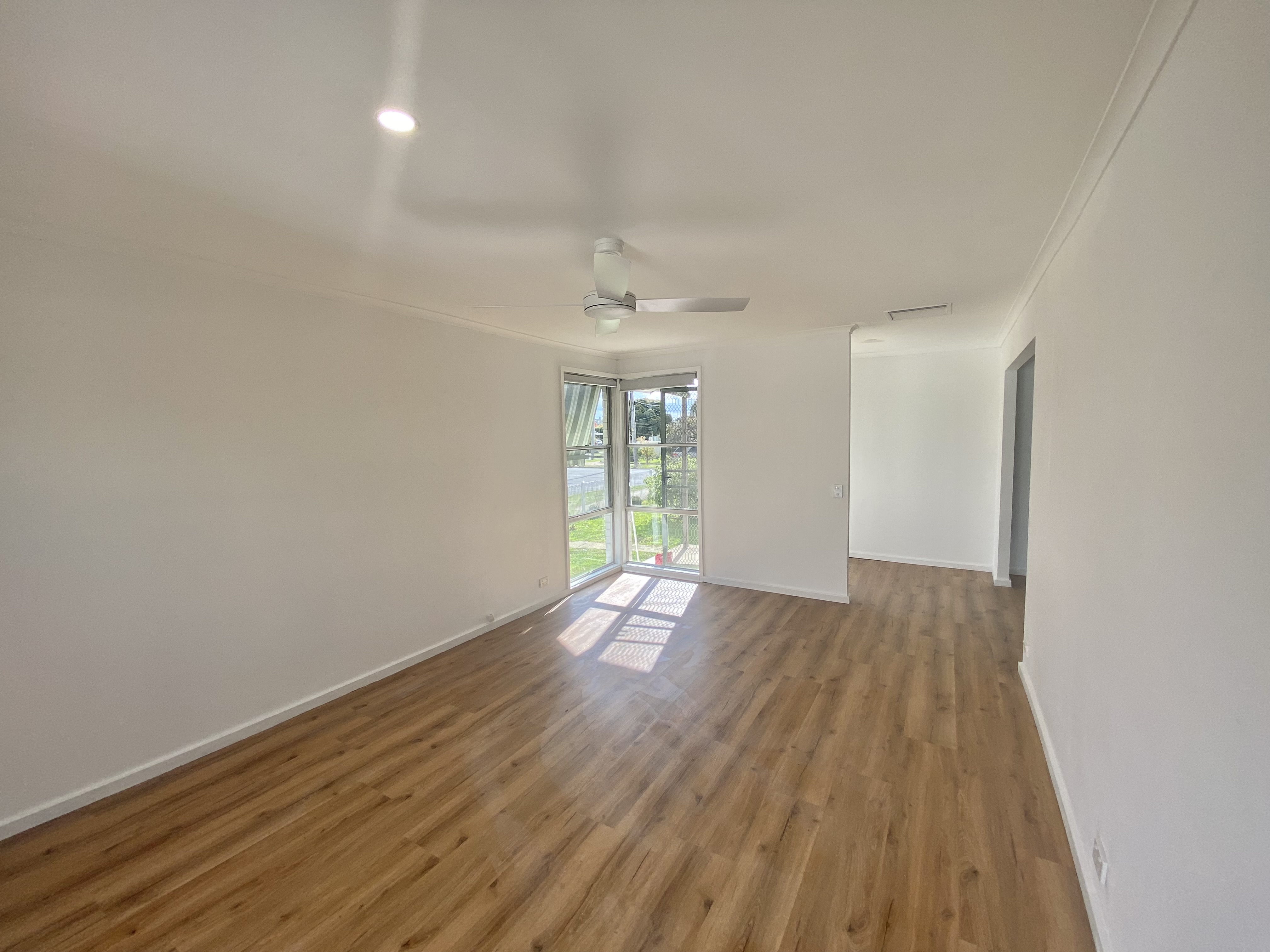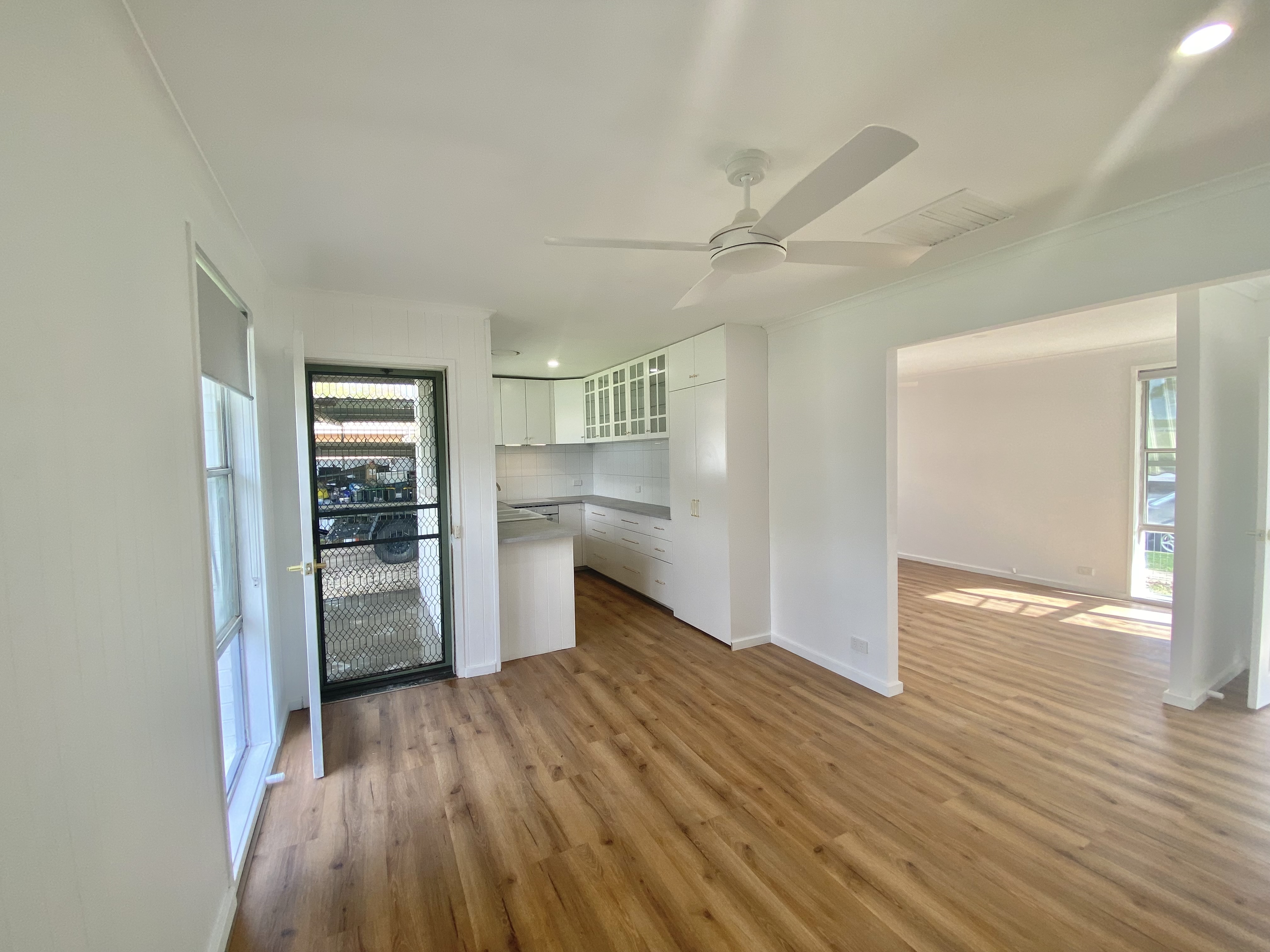 Spacious front lounge room with newly installed split system for heating and cooling and ceiling fans. Open plan kitchen and dining, offering a beautifully renovated kitchen with electric cooking.