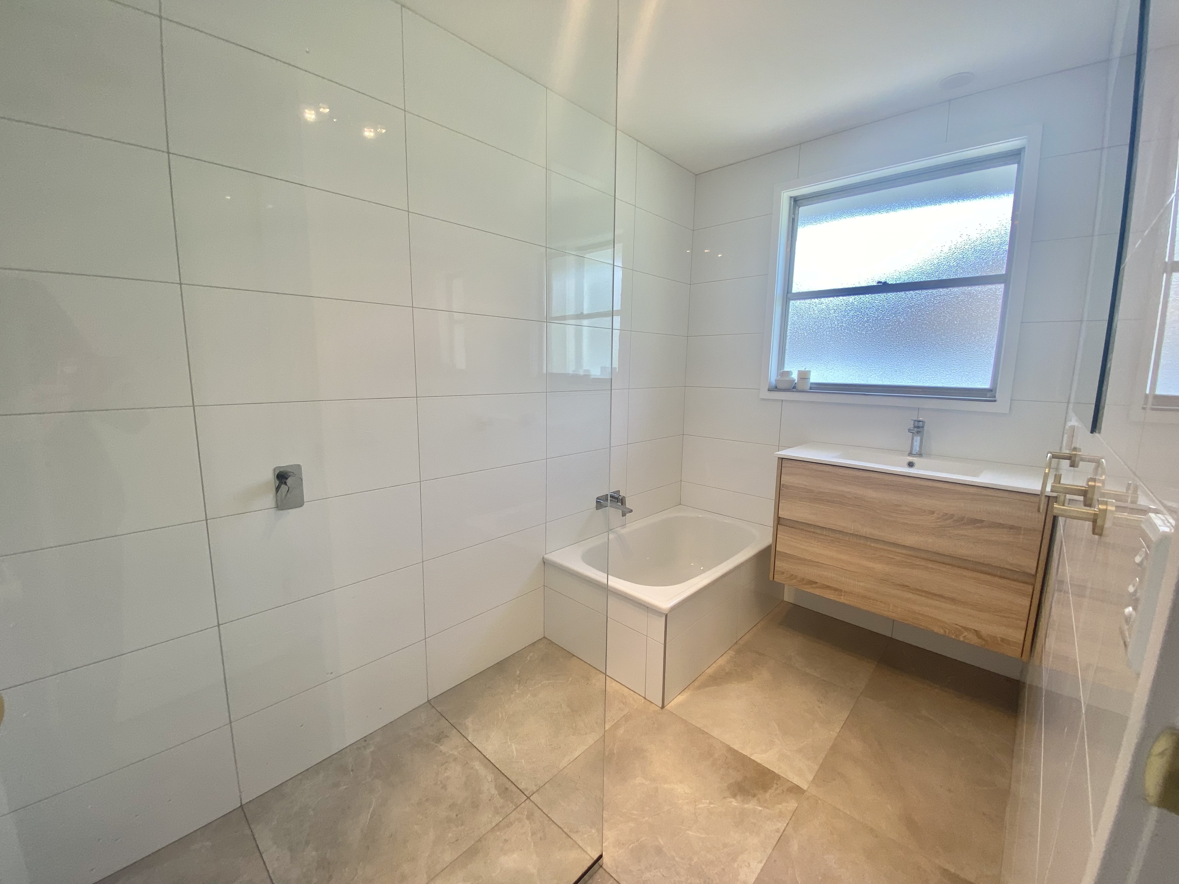A brand new bathroom includes a spacious walk-in shower and bath-tub with the toilet and laundry is separately appointed.