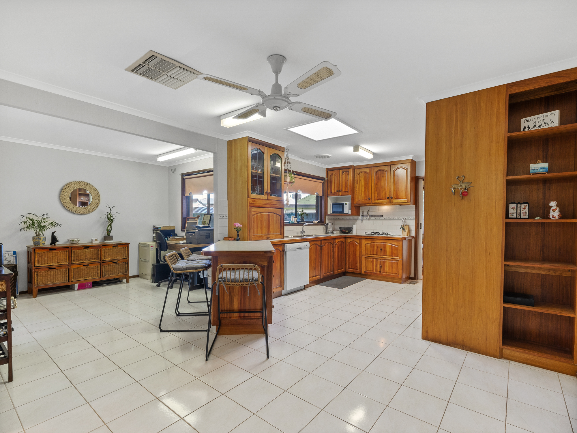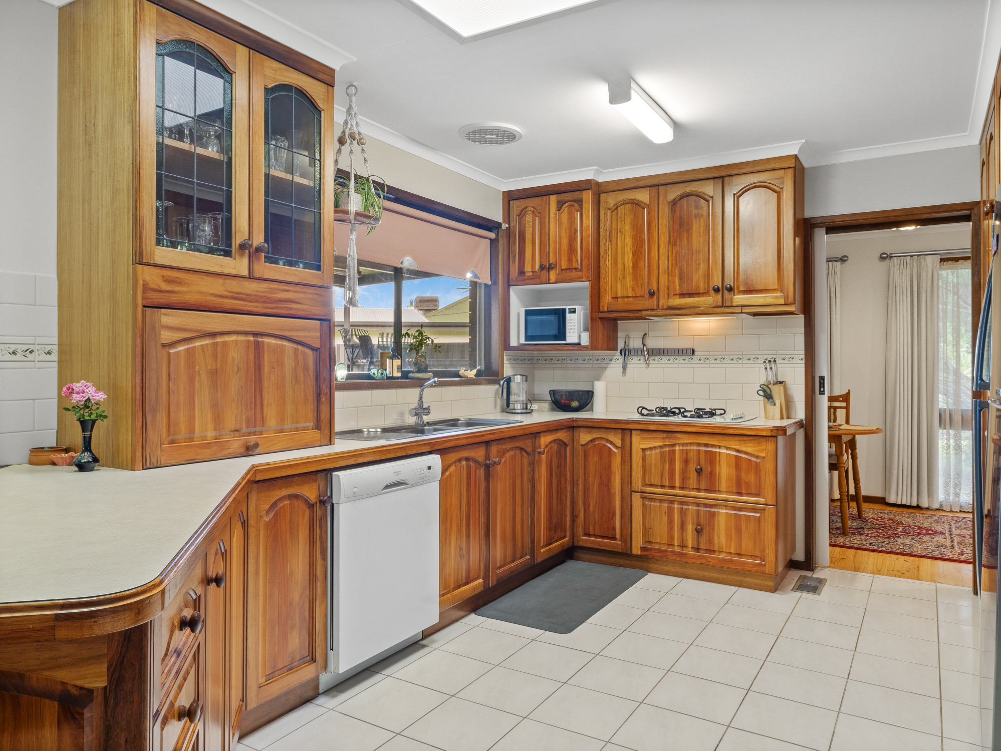 The kitchen has stunning Blackwood timber cabinetry, gas cooking, electric wall oven and dishwasher with an adjoining dining area or study area.