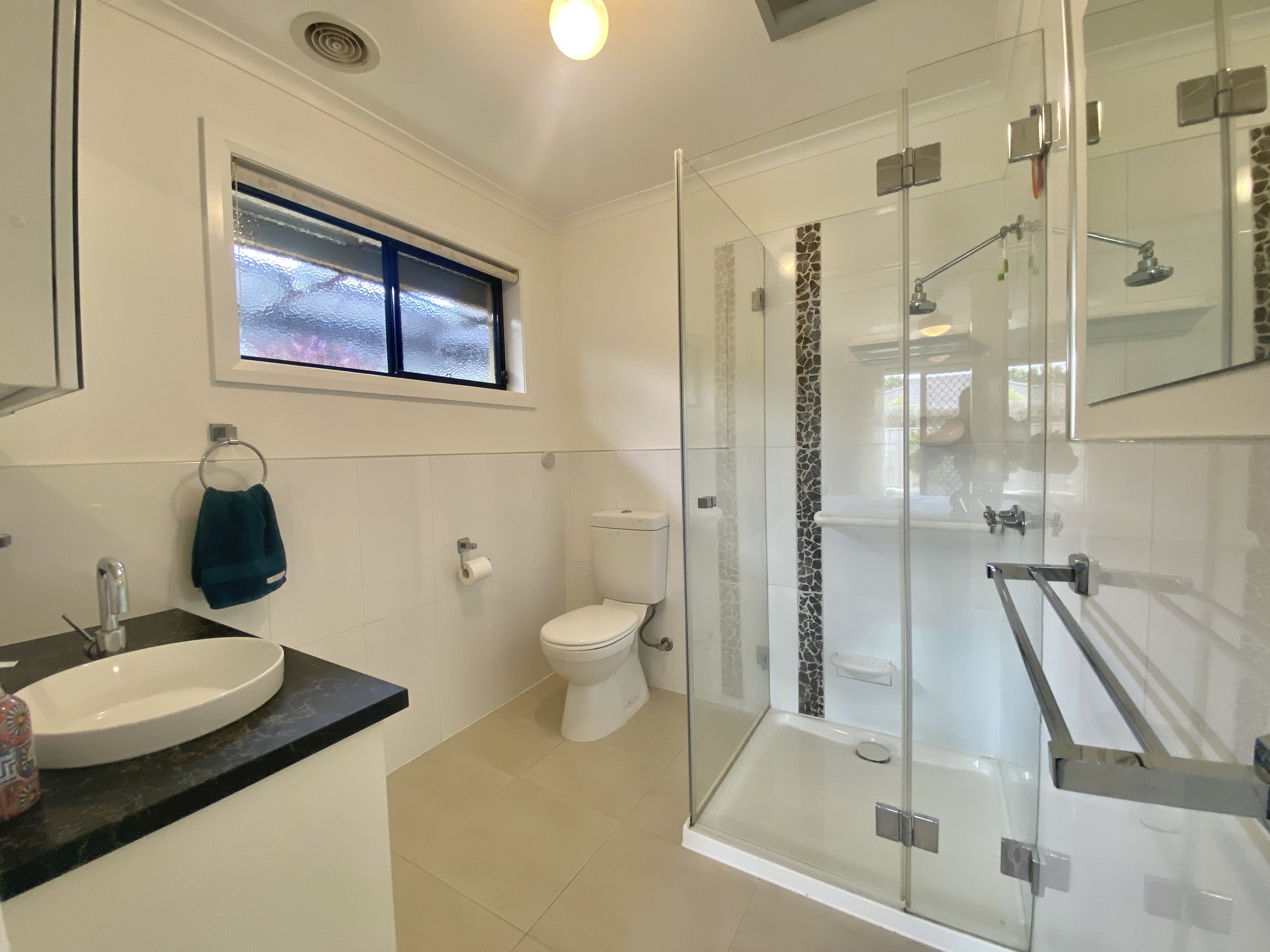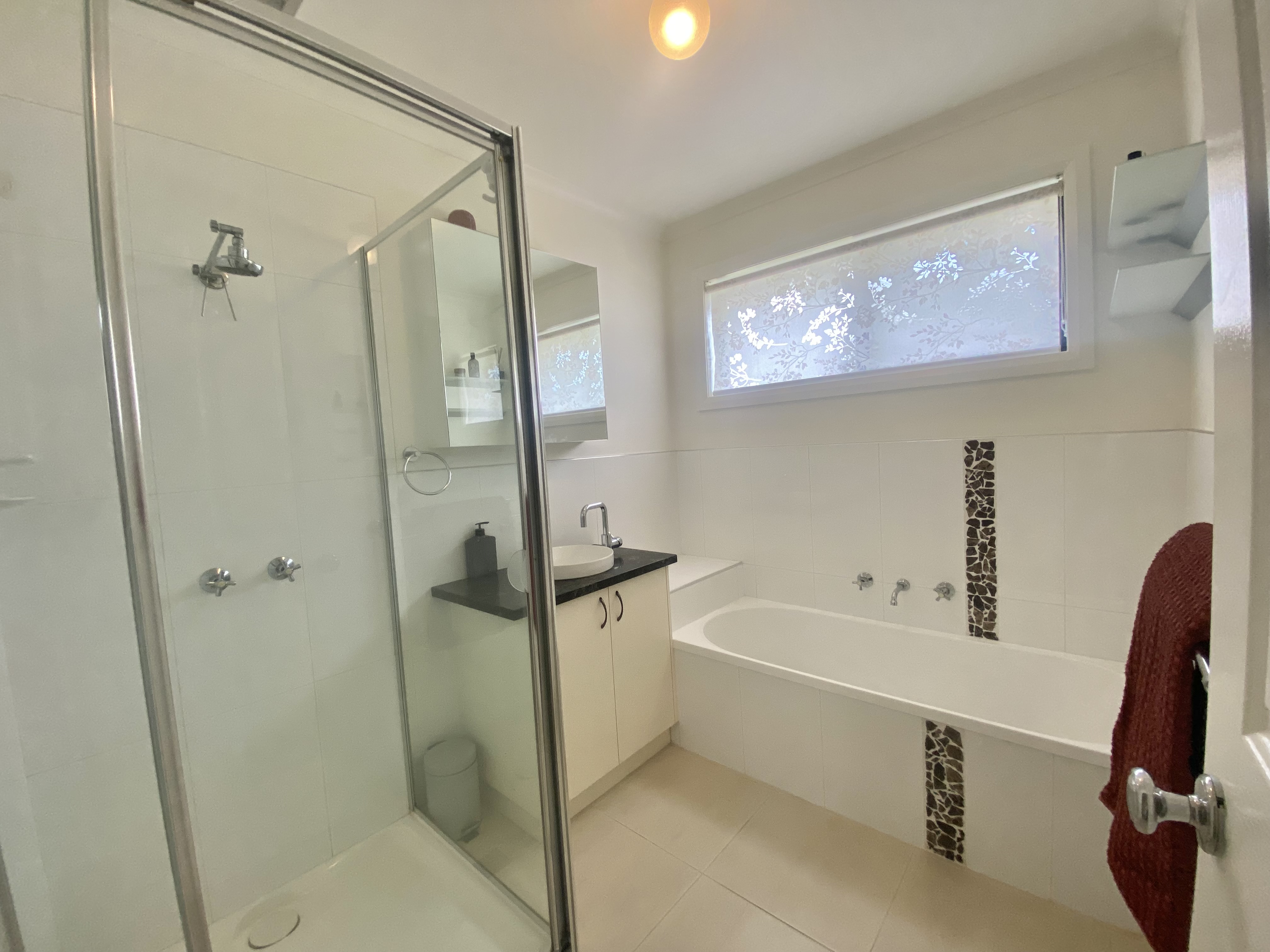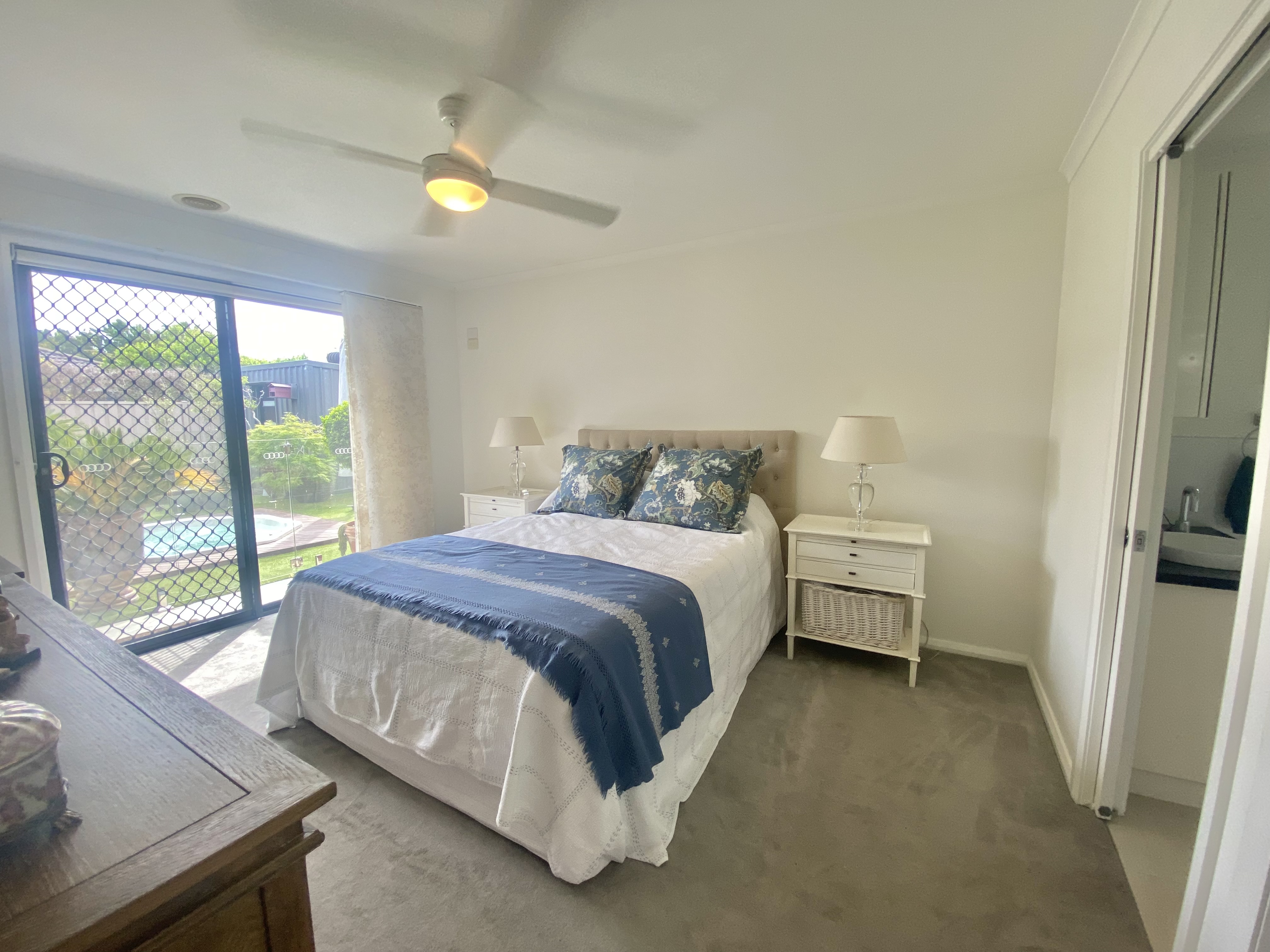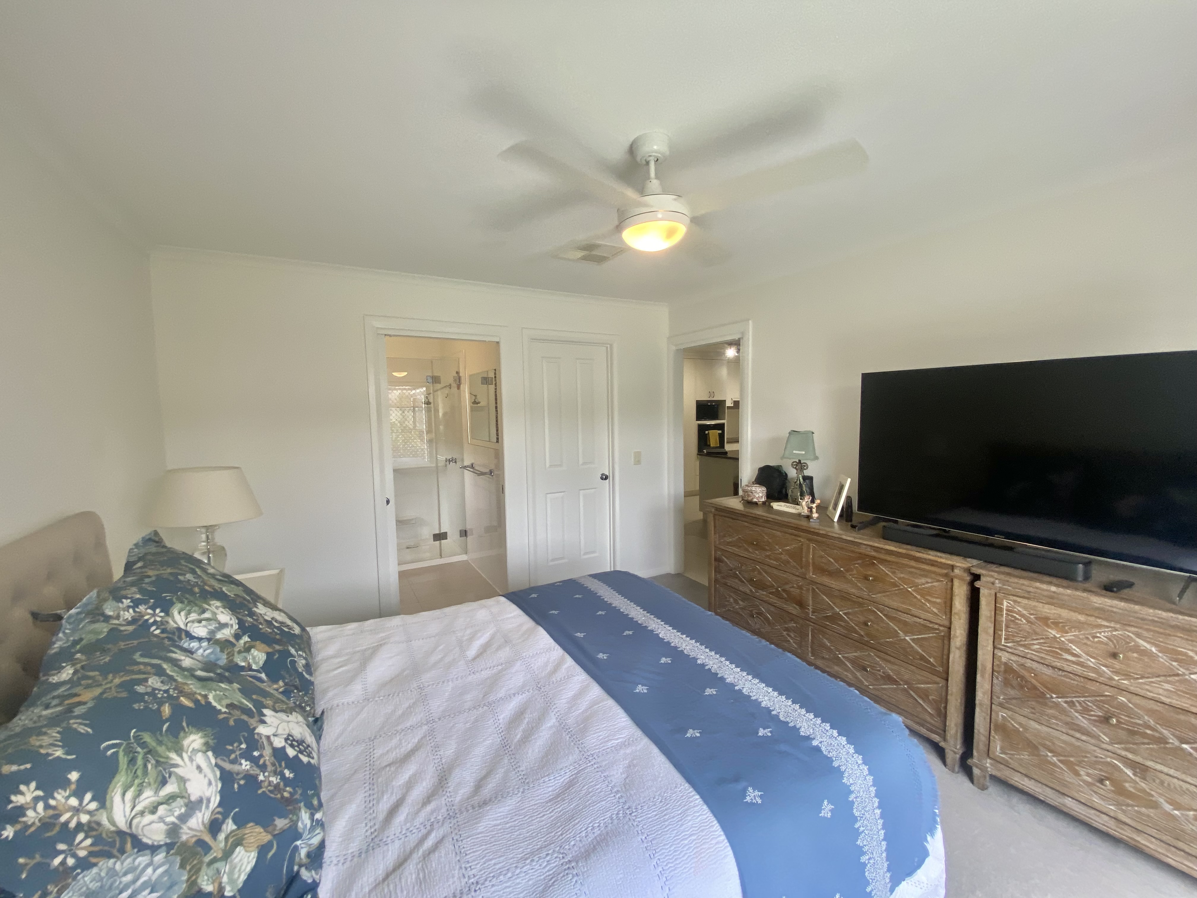 The master bedroom is a true retreat, complete with an ensuite bathroom and a walk-in robe with its own private access to the backyard/spa area. The two additional bedrooms are generously sized and offer plenty of natural light complimented with built-in robes plus ceiling fans. The main bathroom is modern and stylish, featuring a bathtub and a separate shower.
