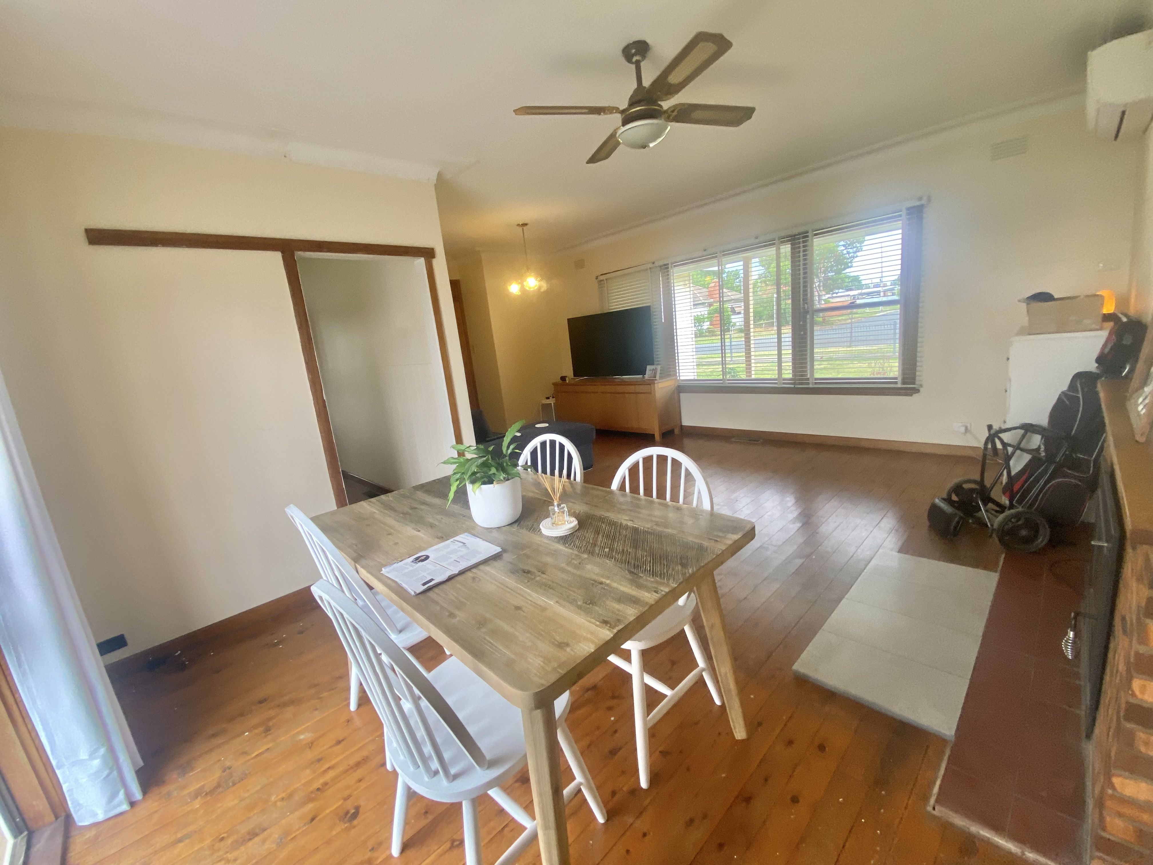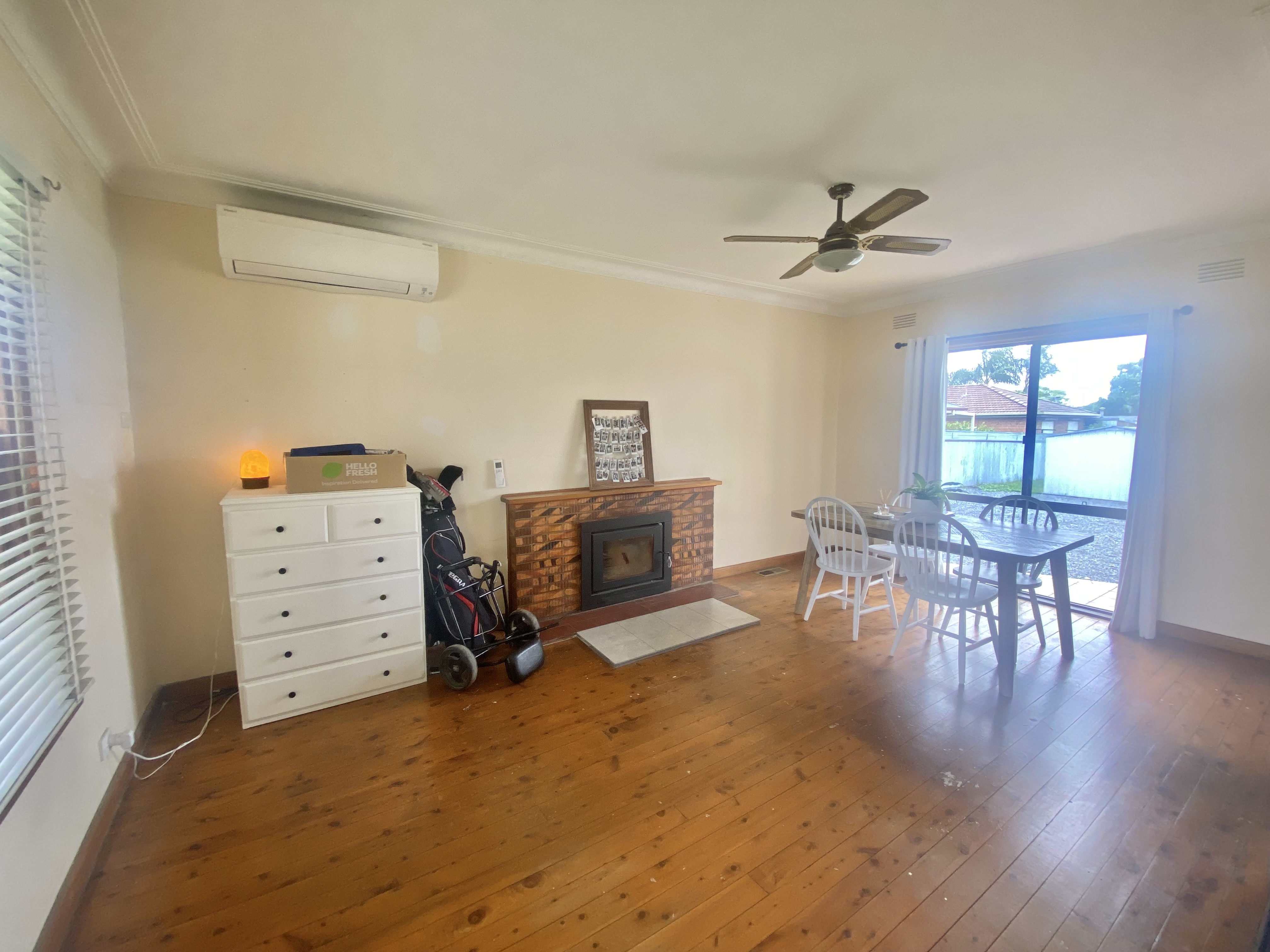- Reverse cycle split system for heating and cooling plus a wood heater
