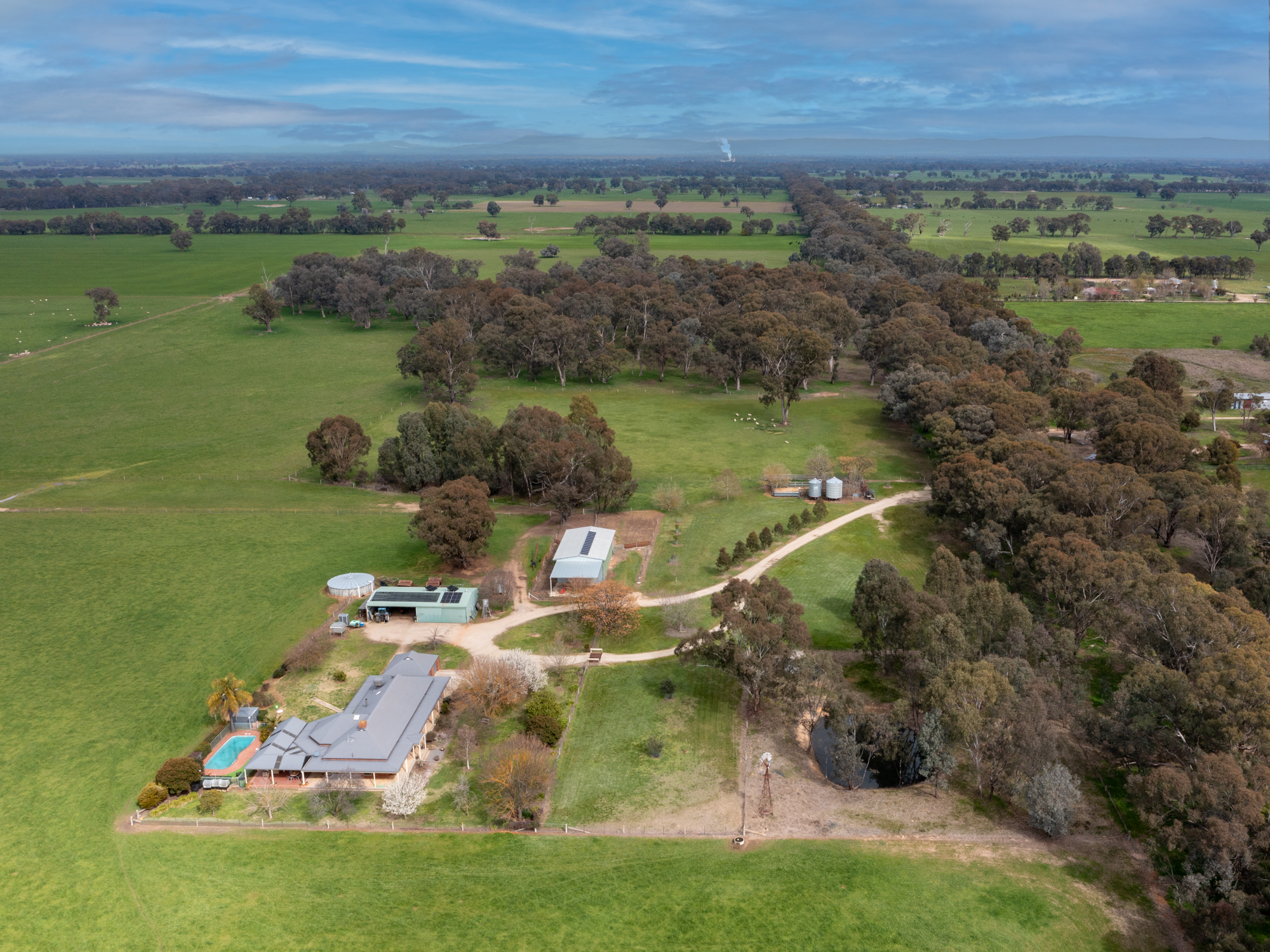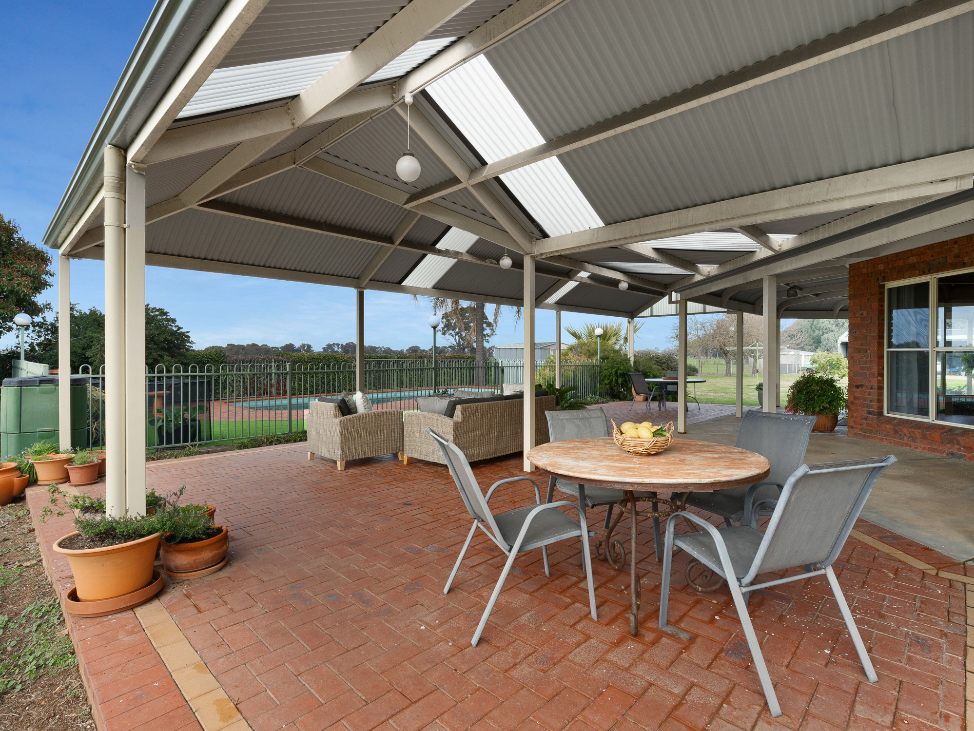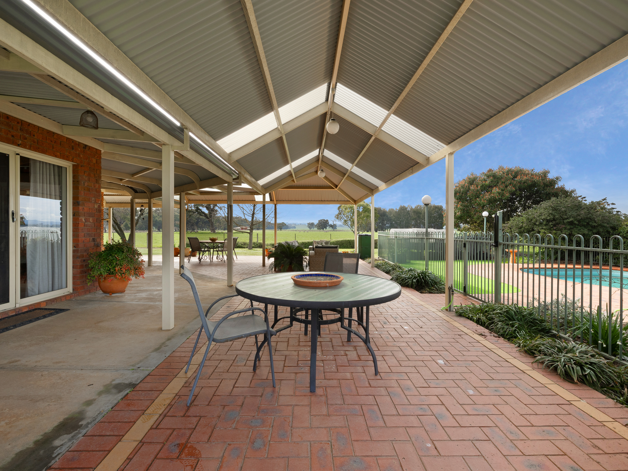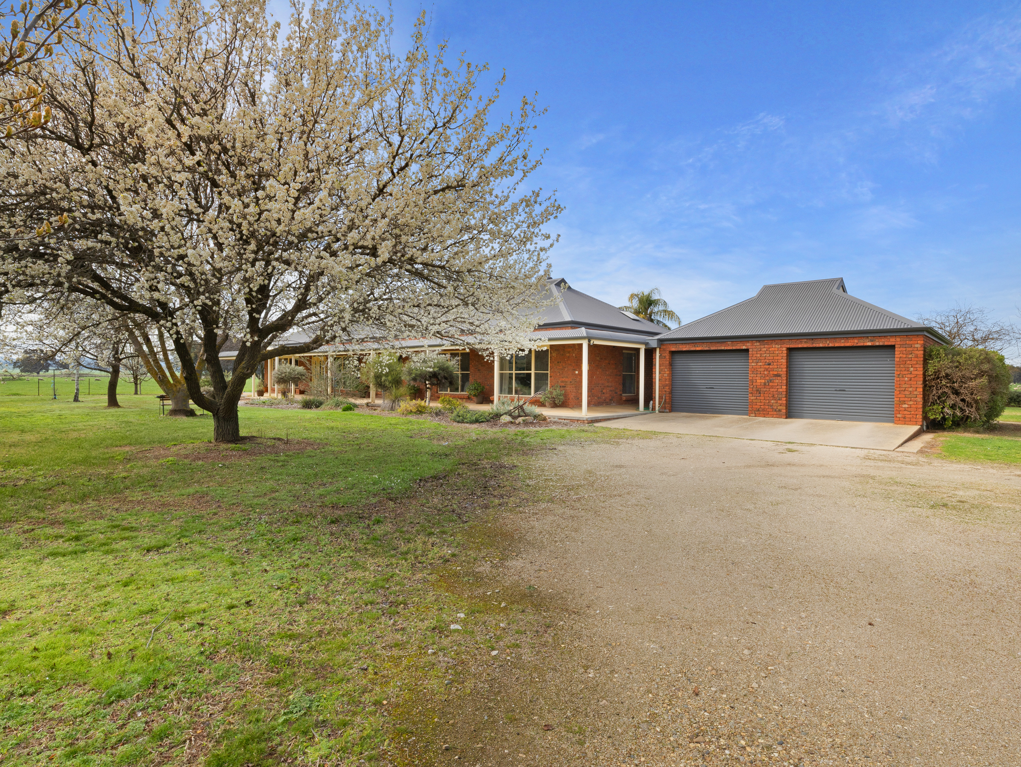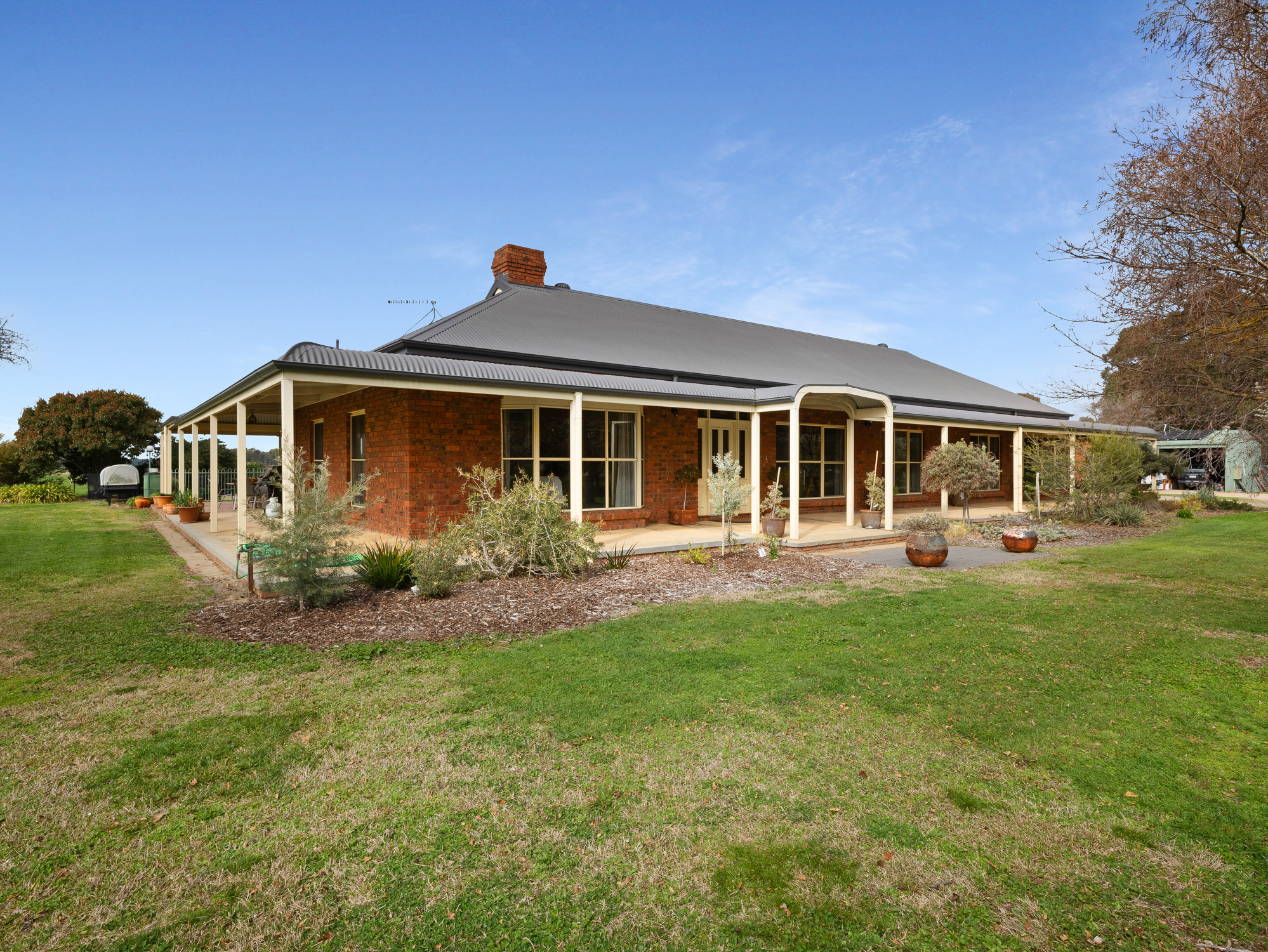 The four bedroom 32 year old brick and colorbond roofed ranch style homestead provides around 242 m2 of living area with wide bullnose verandahs on four sides plus a two car enclosed brick garage. All bedrooms have built-in robes whilst the master bedroom has a walk-in robe plus full en-suite. The main bathroom has a spa bath. There are two main living areas including a formal lounge with large open fireplace. The Tasmanian Blackwood kitchen/family room is the focal point of this spacious home and opens directly onto an extensive covered outdoor entertaining area with inground pool (solar heated, salt chlorinated and self cleaning). Other noted features of the home are high ceilings, bay windows, central vac system, evap cooling, multiple ceiling fans and a solid fuel space heater. The refurbished kitchen is equipped with a new gas cooktop, double electric wall oven, new dishwasher, porcelain benchtops and walk-in pantry. The property has an 8.5 kw solar array with a fast charge facility as well as Starlink for high speed internet.