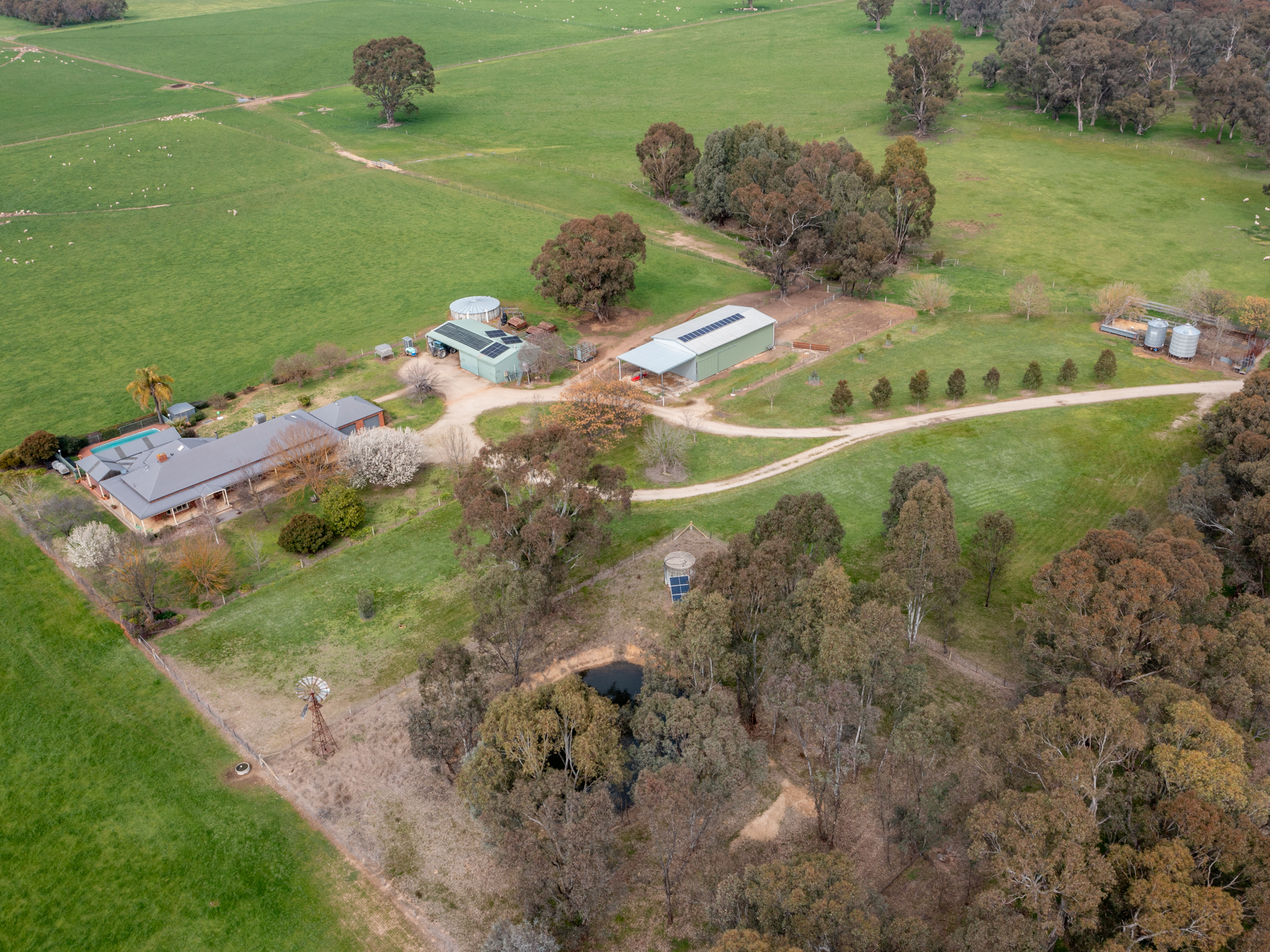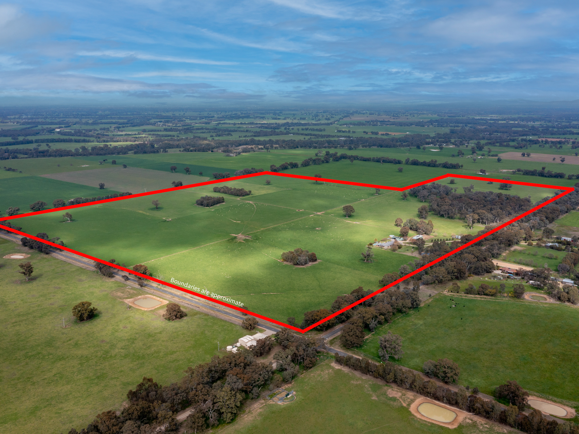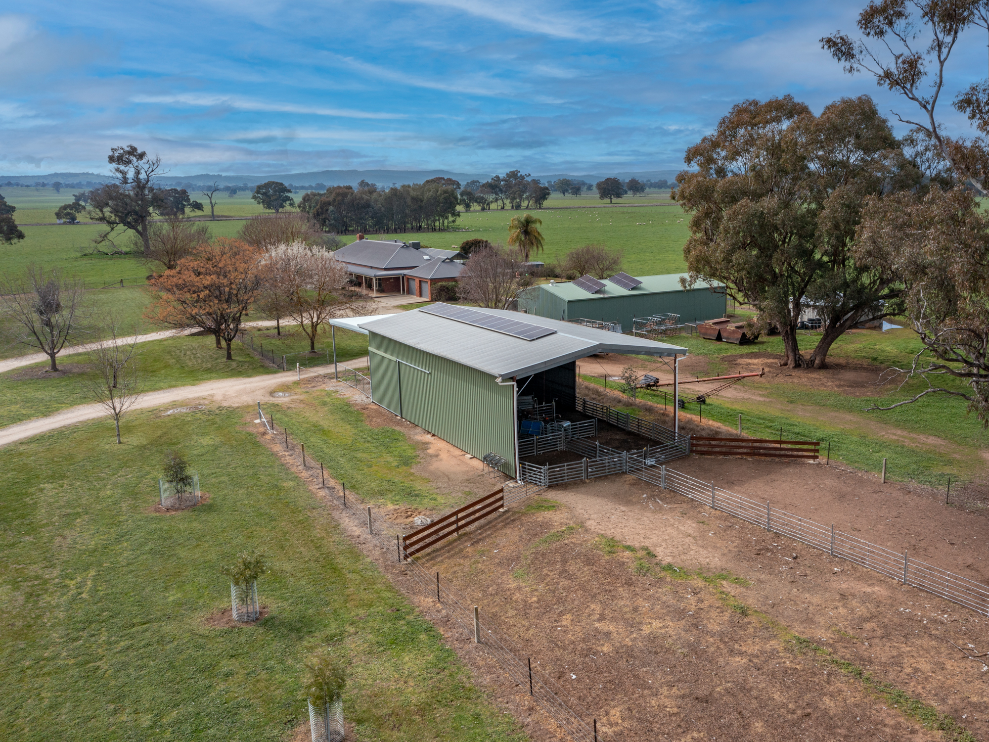‘Dirrawarra’ at No. 606 Byawatha Road just 13 km by sealed road from Wangaratta and a 35 minute drive from Wodonga is a highly productive grazing property with excellent improvements that would be the envy of larger landholders. The 208 acre (84.3 ha) holding in two titles is subdivided into fourteen main paddocks with first class fencing throughout. It’s all arable well drained land exhibiting evidence of well managed pastures and a fertilizer history. Currently producing prime lambs, the property has a proven history of cattle production. There are two sealed road frontages which provide management benefits. Established fenced paddock plantations compliment a sheltered reserve of native timber. Water supply is a top feature of the property and is based on a reliable, quality bore, a well with mill, a spring fed dam plus a 126,000 litre roof catchment concrete tank. All Paddocks are watered from the solar pumped bore supply.
