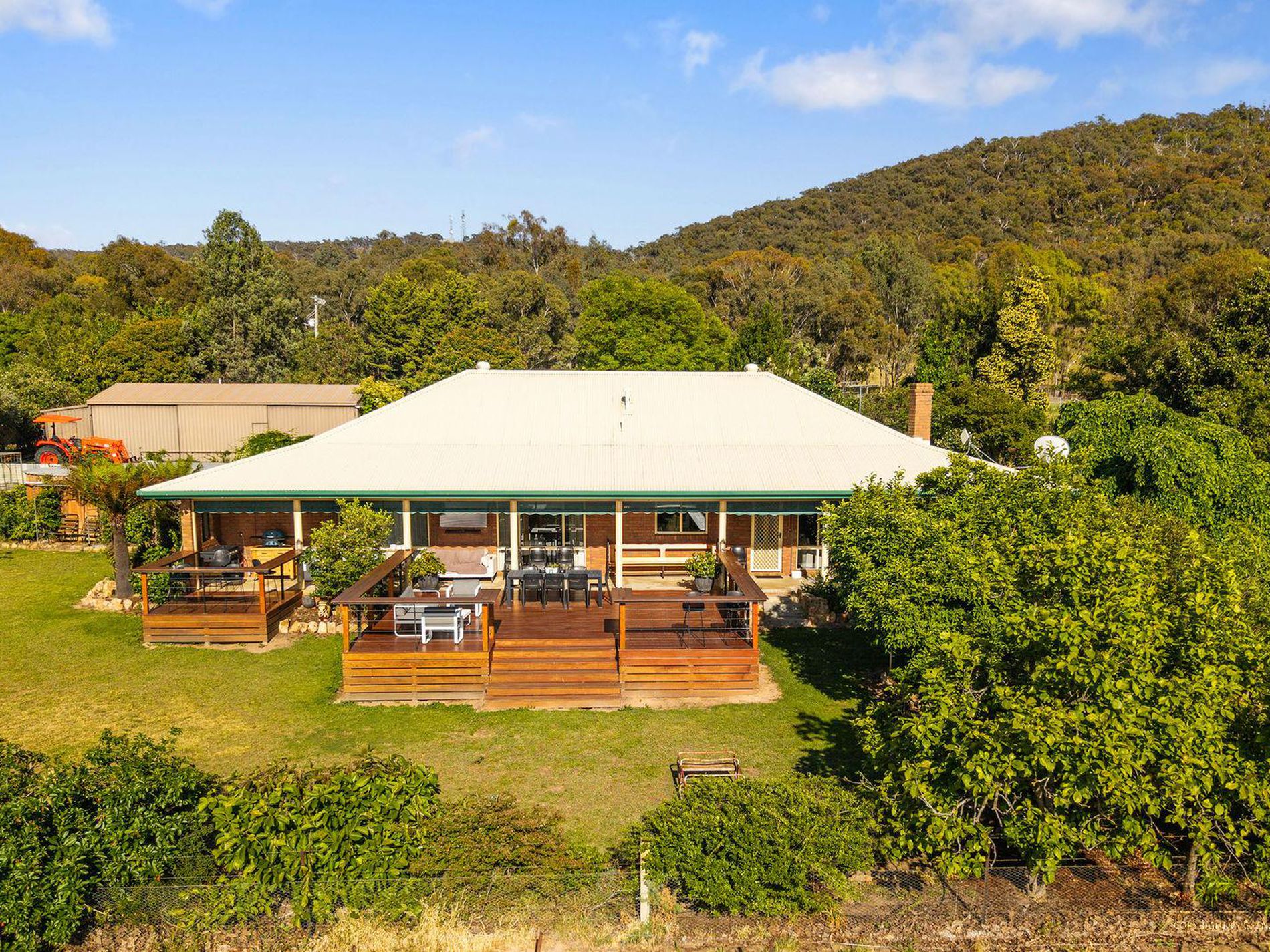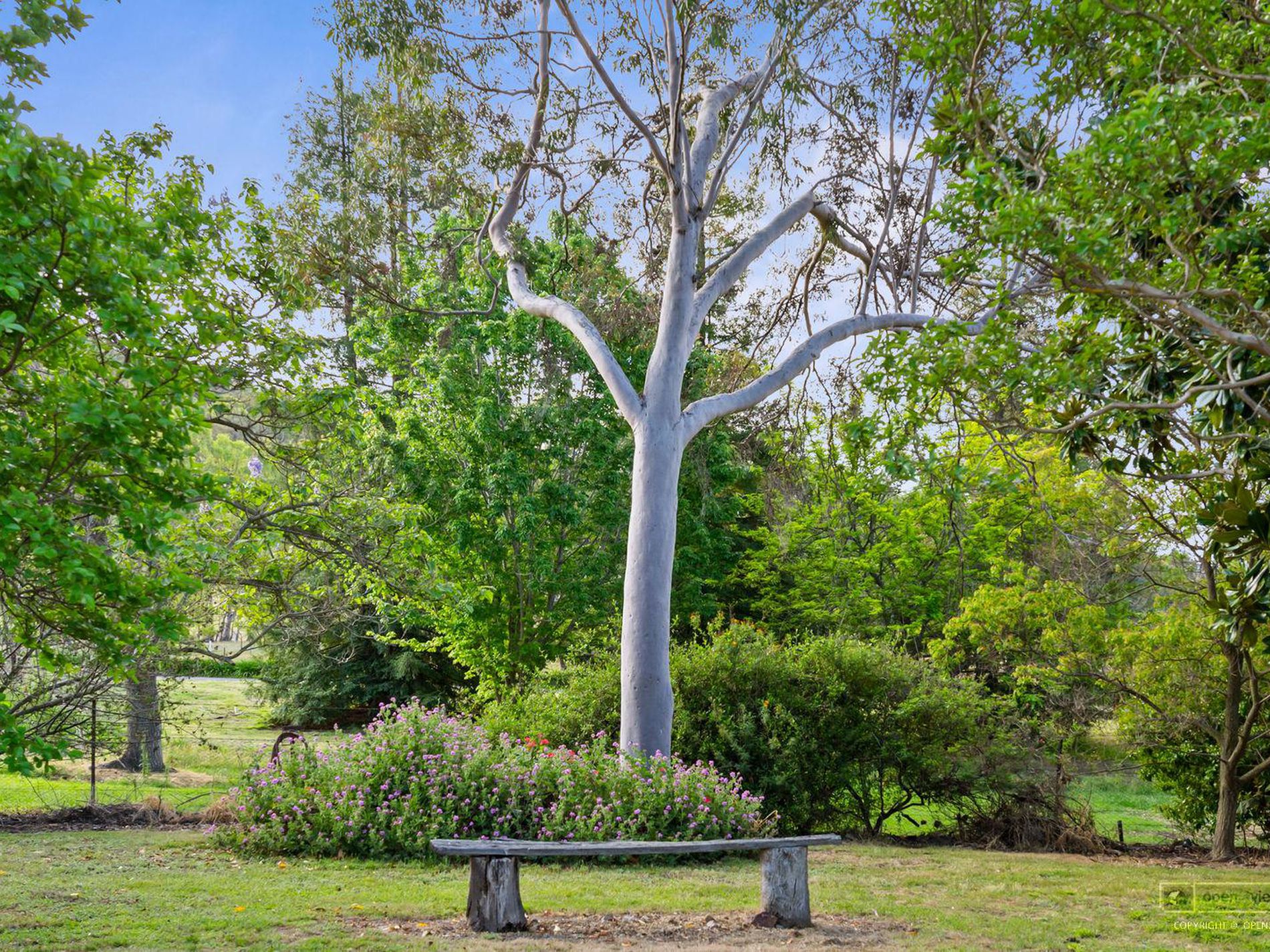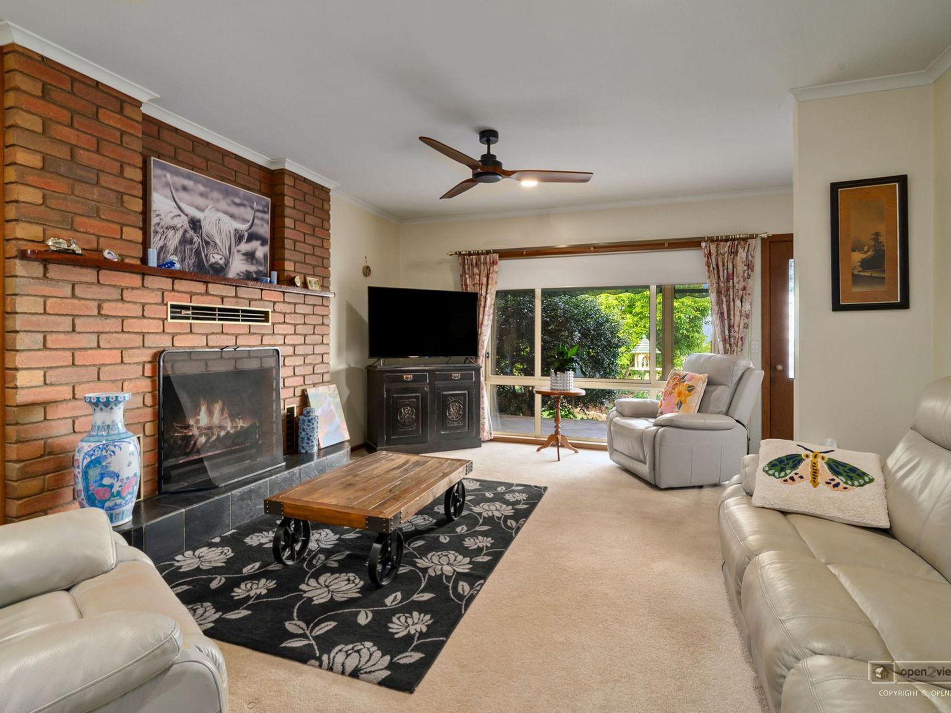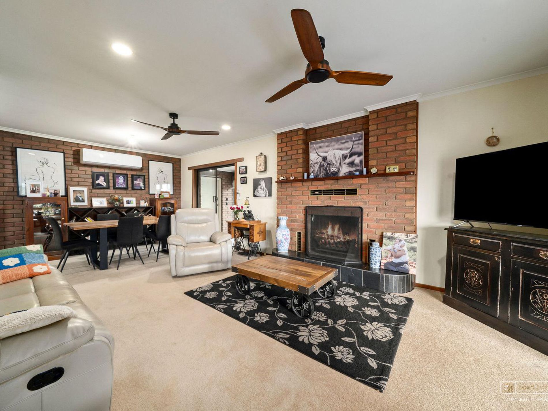 Wide, sheltered verandas provide shady outdoor living spaces, while inside, modern comforts ensure year-round livability. Double-glazed windows, reverse-cycle air conditioning, and two solid fuel heaters create a warm and inviting atmosphere throughout the seasons.