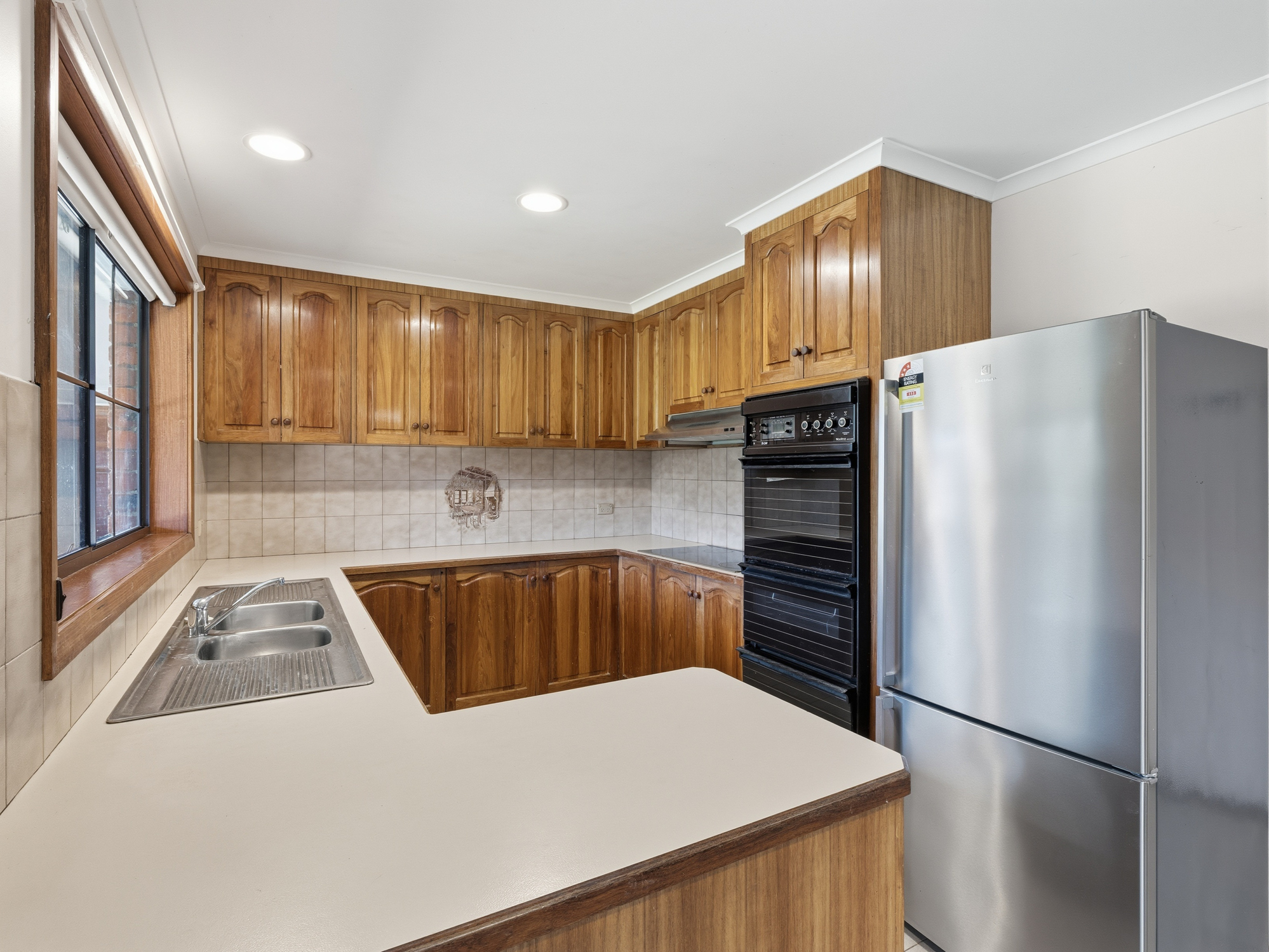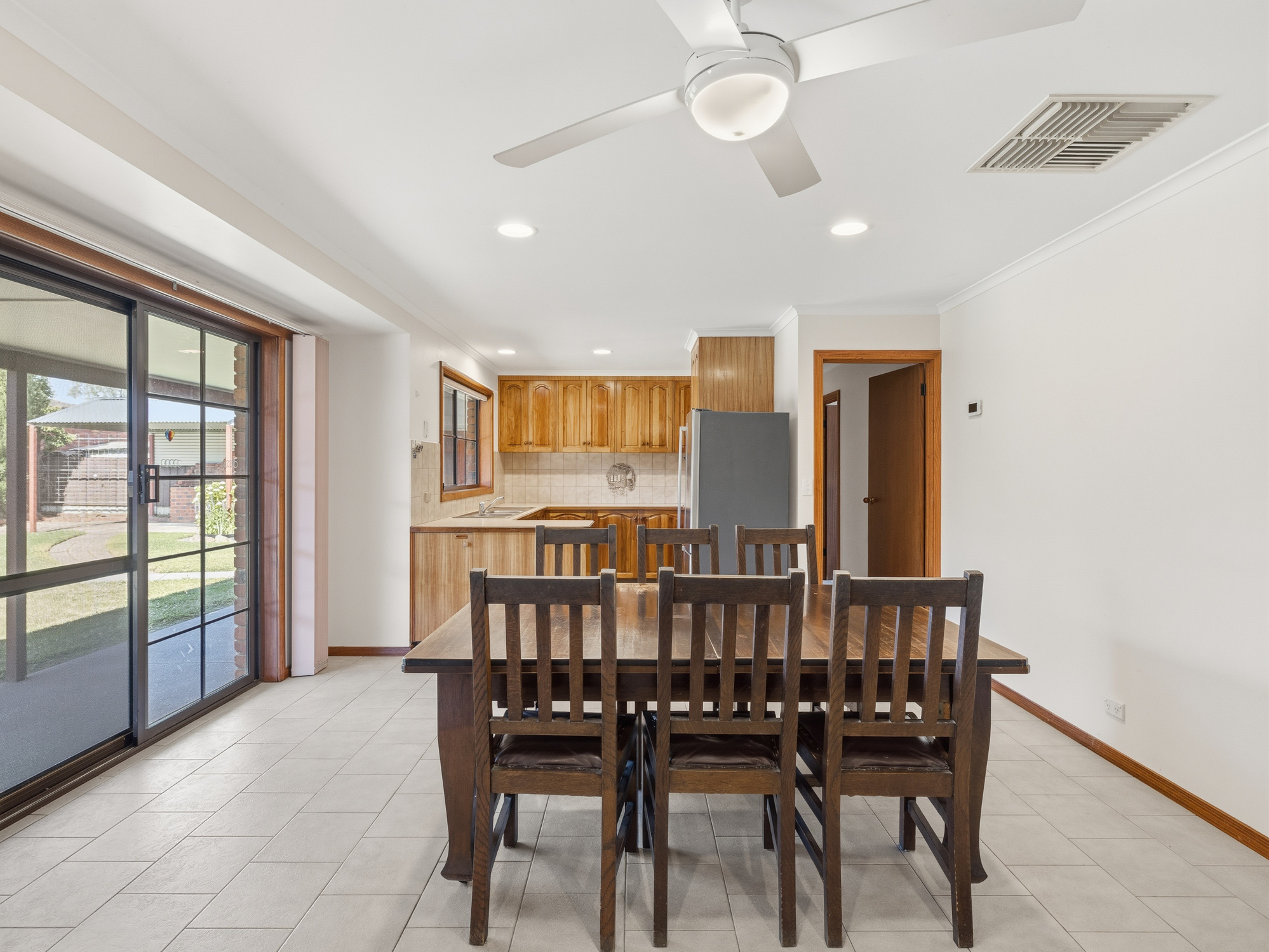 The large north-facing lounge is filled with natural light and flows through to the warm timber kitchen and adjoining dining/family area. An electric wall oven and hotplate add modern convenience, while Rinnai gas heating and ducted evaporative cooling ensure year-round comfort.