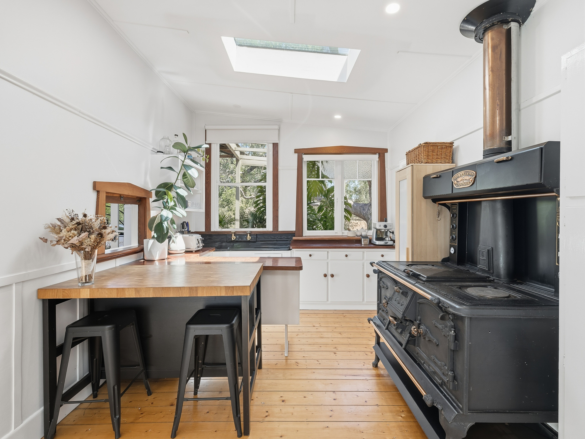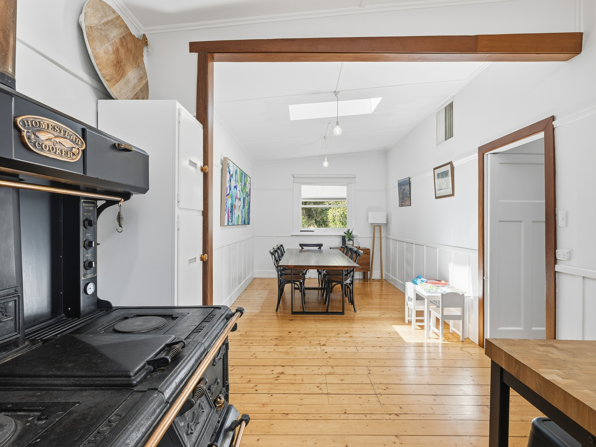 Designed for relaxed living, the layout includes a separate lounge room with Euro fireplace, a separate kitchen and dining area, and a walk-in pantry including dishwasher —perfect for those who love to cook and entertain. The kitchen is equipped with a country homestead style stove offering both electric and solid fuel cooking options, adding to the home’s rustic charm.
