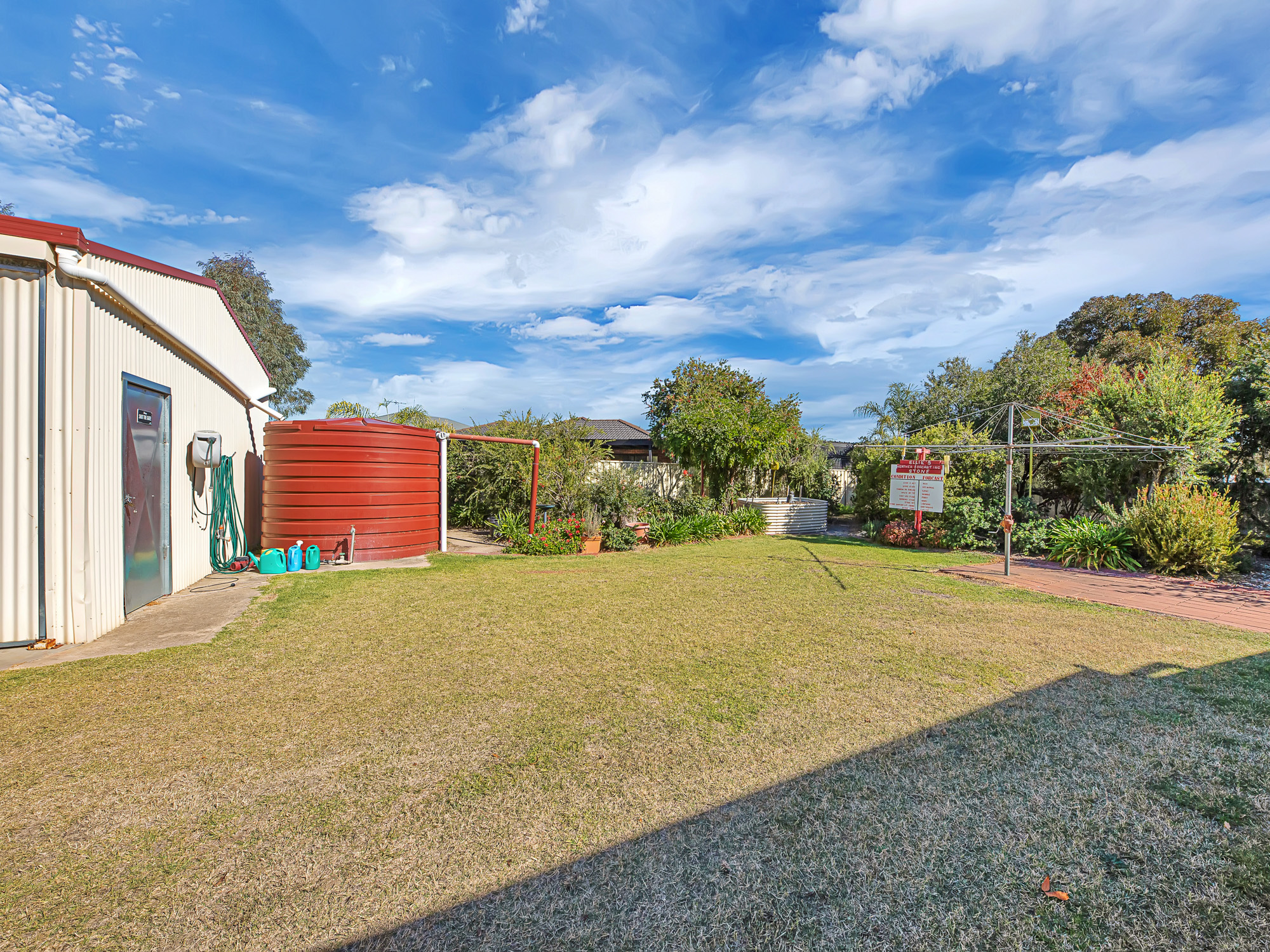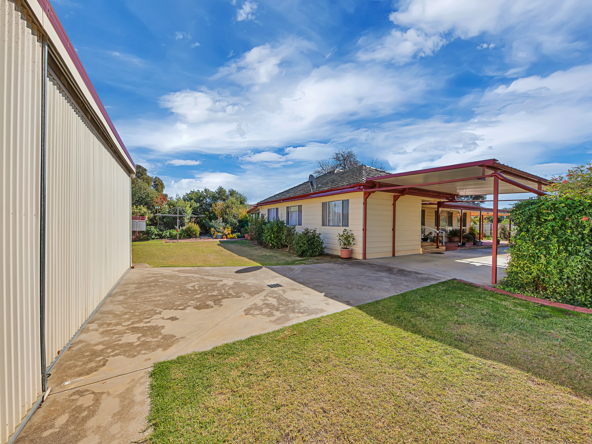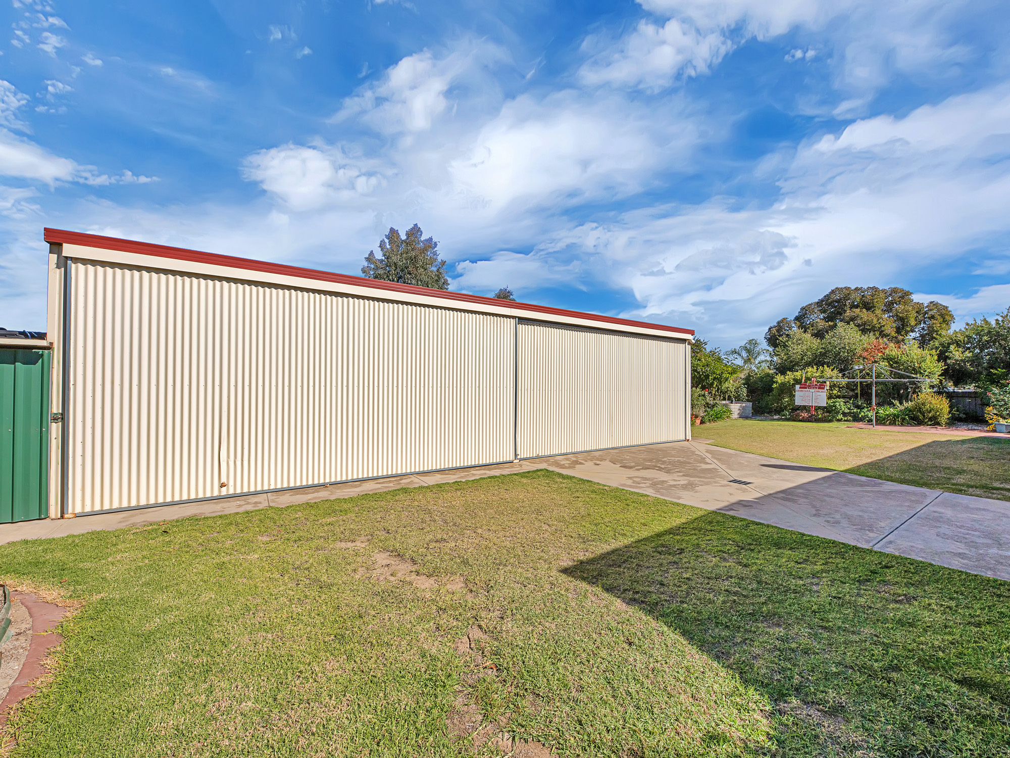 The secure all steel fenced yard has a quality 6m x 12m steel framed and colourbond clad general purpose shed, which is fully paved, powered and with a wide, high sliding access door.